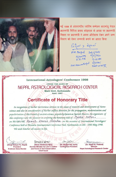 Astrologer Kumar Umesh Chandra is vedic Astrologer,Palmist and Tantra Yogi of international fame.He has delivered his research paper on Astrology and Yoga in an International conference on Vedic Sciences at B.H.U Varanasi UP.He was awarded GOLD MEDAL in an International conference on Astrology in Capital of India Delhi.He was given the title of "Eye of Vedas" in an International conference in Kathmandu,Nepal.